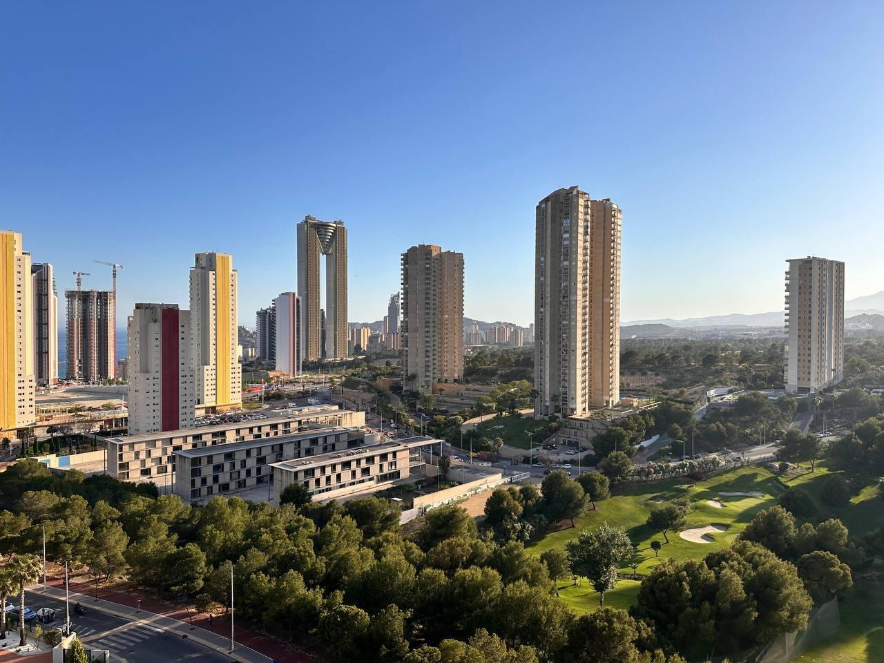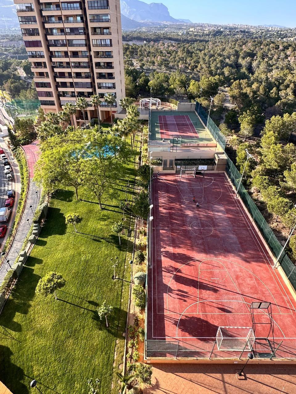 Se vende un acogedor apartamento en la playa de poniente en Benidorm. Inmejorable urbanización con zonas verdes, varas piscinas, gimnasio, sauna, zona infantil al lado de campo de golf. Vistas muy bonitas.~El apartamento no es muy amplio pero tiene una gran terraza con vistas al mar, nunca ha sido alquilado, esta en muy buen estado. Se vende amueblado con garaje y trastero incluido en el precio.~