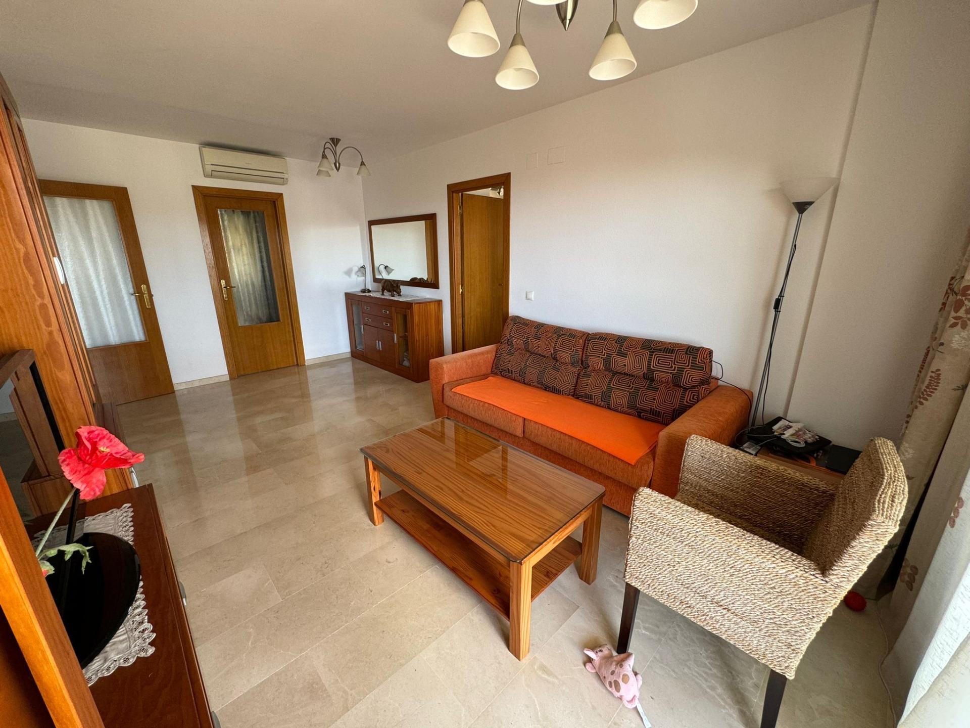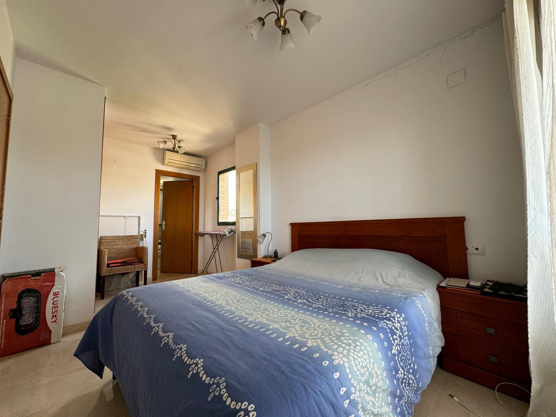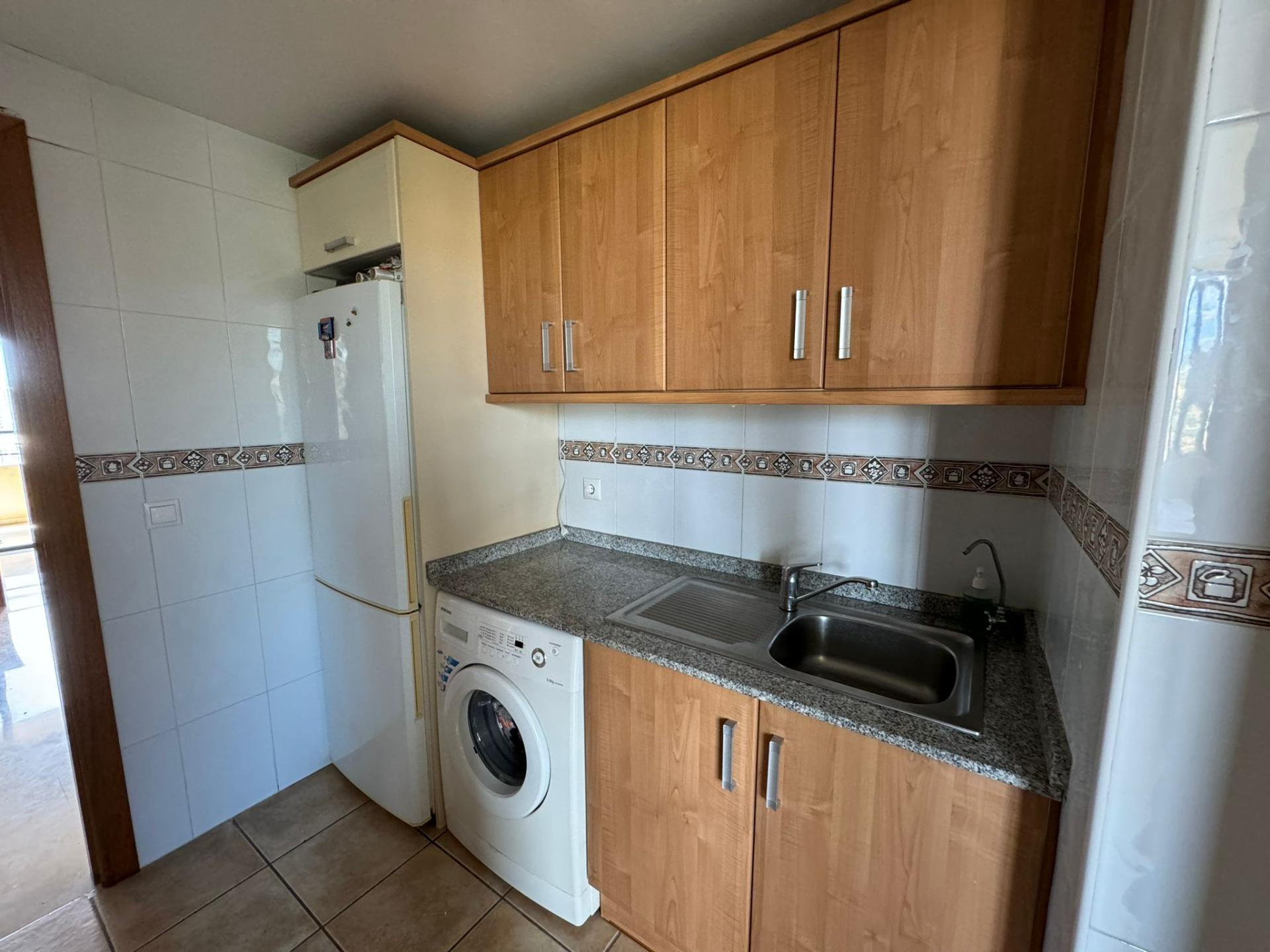 Apartamento consta de 2 dormitorios amplios, 2 baños, cocina independiente con comedor, salón con terraza con vistas al mar, en segunda planta con gran solárium. Urbanización con piscinas, zona infantil, gran garaje para 2 coches con posibilidad de cerrarlo.~